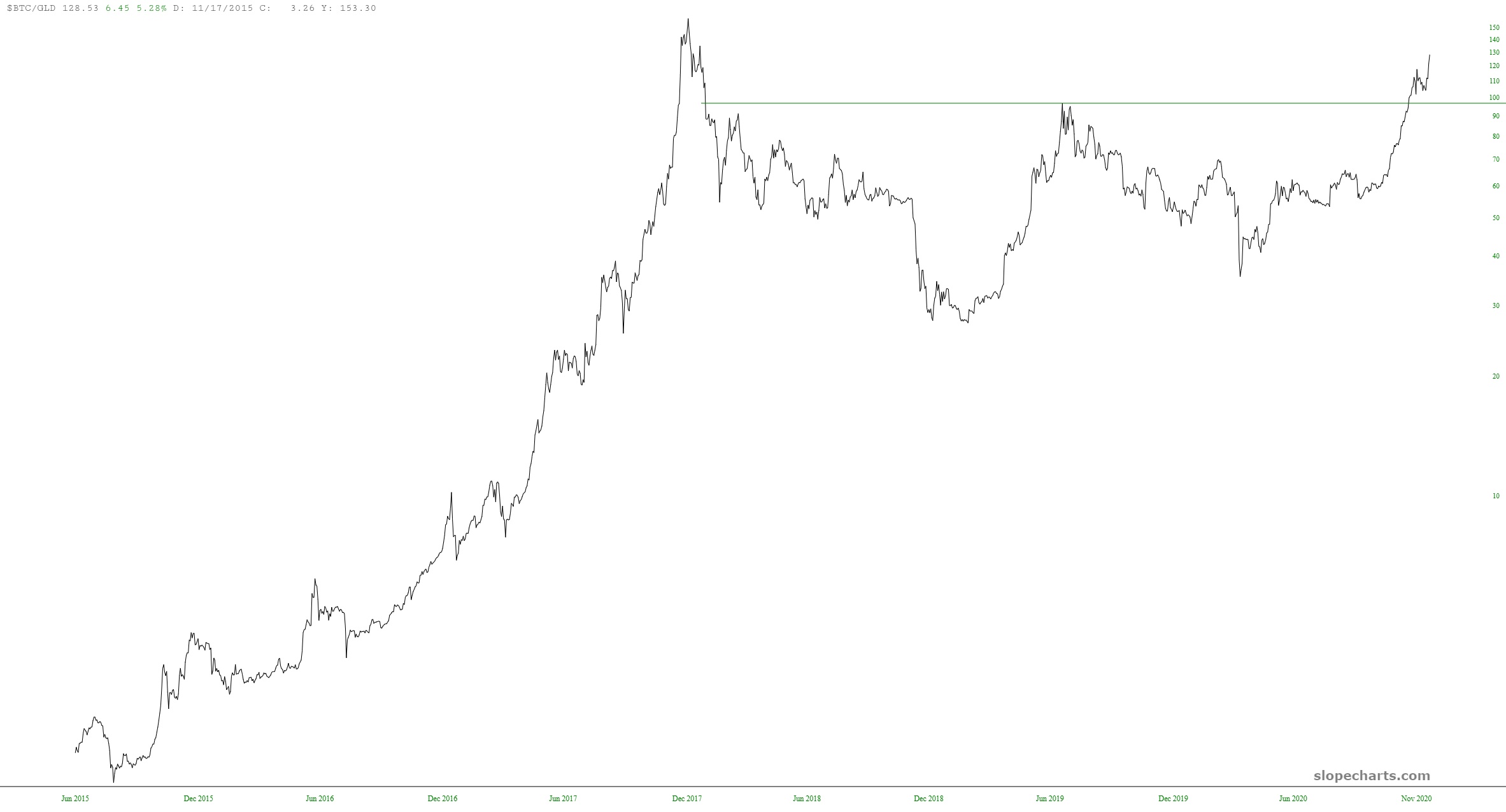 If one is looking for an opportunity to get into crypto at a “good” price (and the quotes are deliberate, because this is all just nuts) I’d suggest watching the bitcoin/gold ratio, which is a fantastic bullish pattern. If it eases back to the green line, that seems like an opportune time to take the plunge.