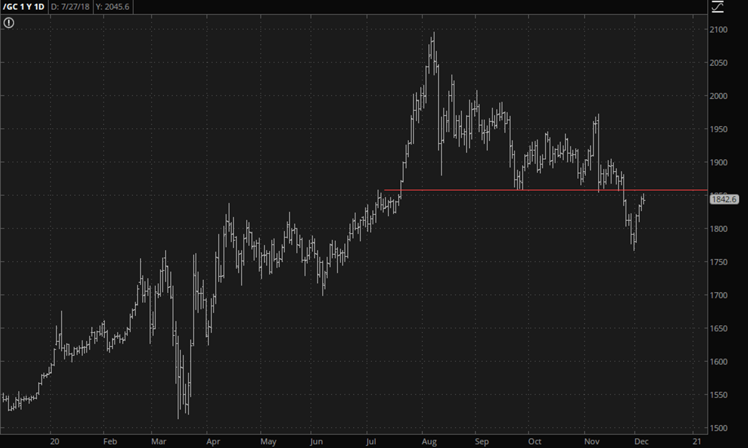 One of the few assets that remains vulnerable right now appears to be gold, whose strength in recent days has done little but to push it up against the large, failed right-triangle pattern defined as everything above the red horizontal. As I’m typing this, gold has already flipped from green to red.