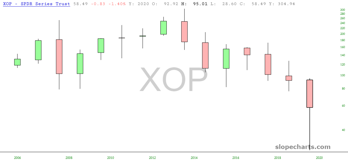 Because it is a leveraged instrument, TNA shows in an amplified fashion how insane the moves of 2020 were. This triple-bullish-on-small caps fund has a gargantuan lower wick and a very small body, showing how the closing price wasn’t much difference than the open a year prior.