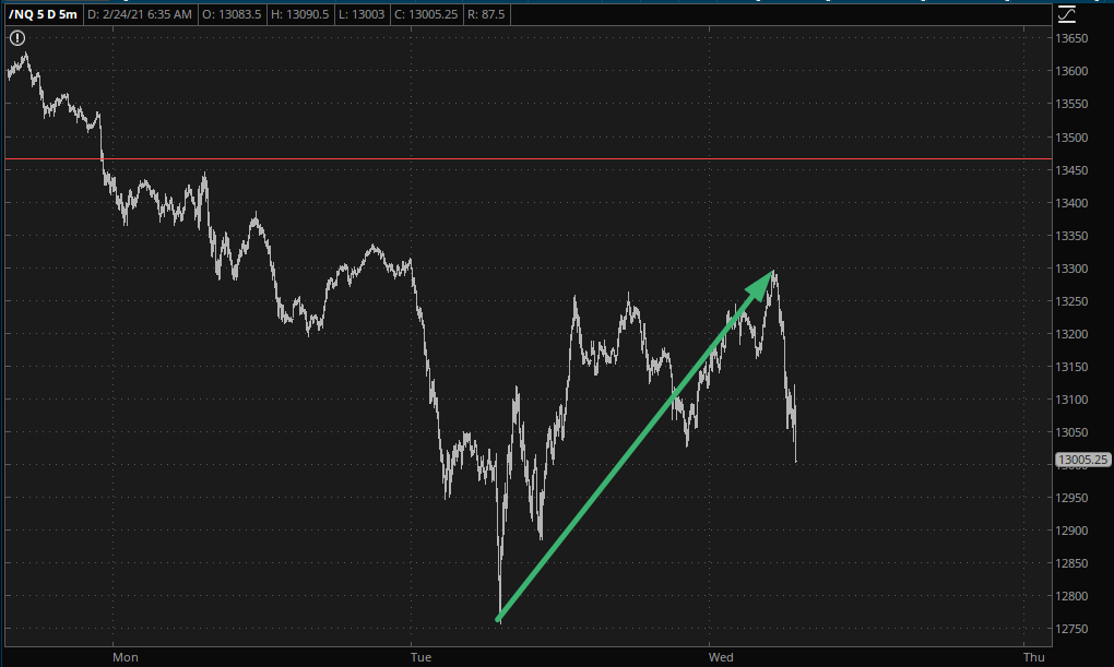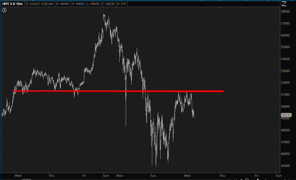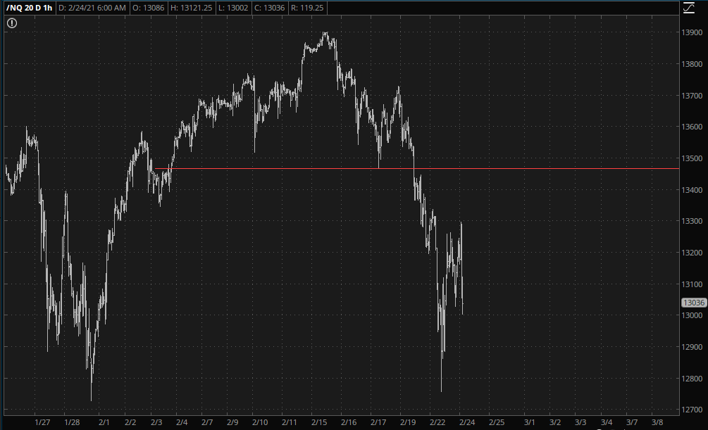 The bigger picture, though, is more revealing. The NQ in particularly is still sporting a very clean reversal pattern, with that horizontal line being the key.