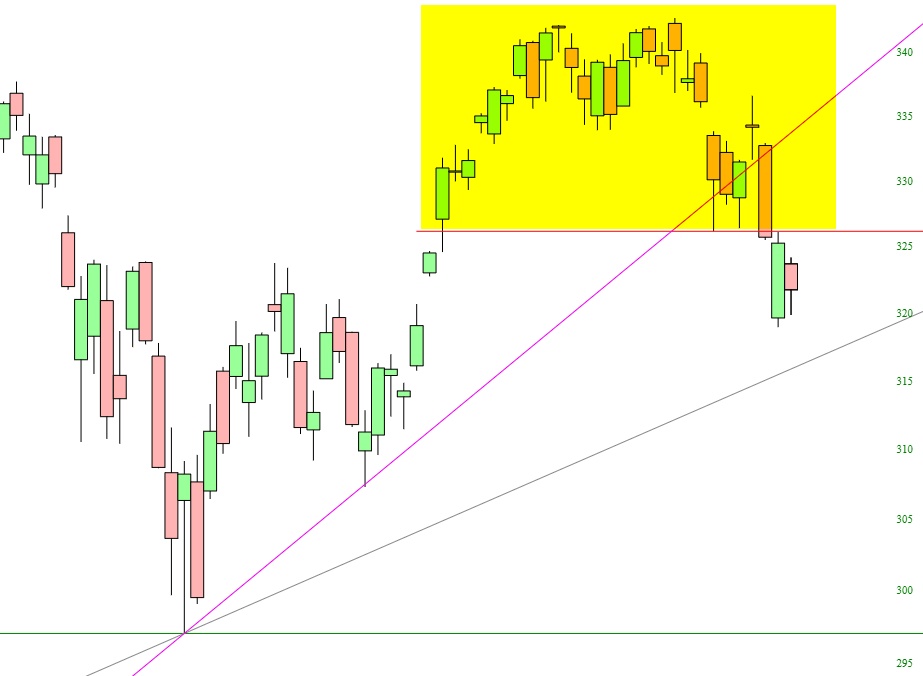 Which the tech stocks (QQQ) aren’t liking at all; take note of the cute reversal top: