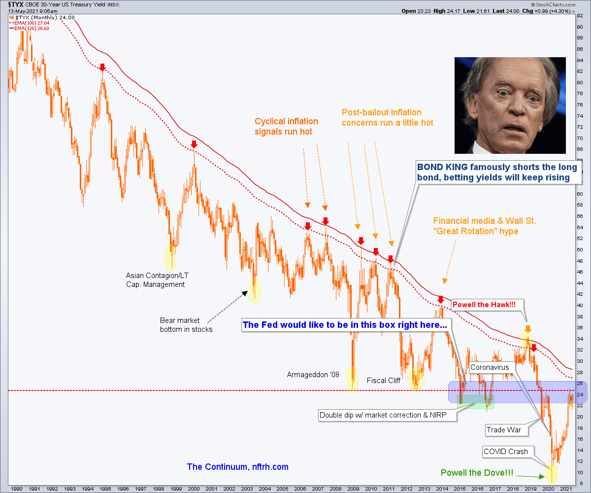Since becoming bullish on the inflation trades last summer after the worst of the deflation scare had played out (notice the spike down on the chart that jerked Powell 100% unequivocally dovish), the expectation has been for this ‘good’ inflation to eventually be replaced by one of two things (using the 30yr Treasury Yield Continuum of dis-inflationary macro signaling as a guide)…
