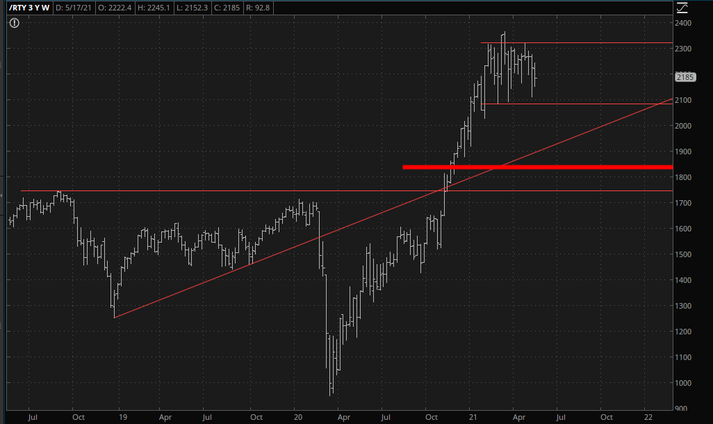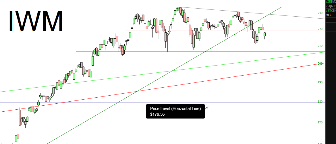 I’d like to mention, once again, that the small caps (as represented by the /RTY below) still has ever real chance of completing its topping pattern. It has been a frustrating, annoying, exasperating wiggle-waggle, but by God, it hasn’t broken yet.
