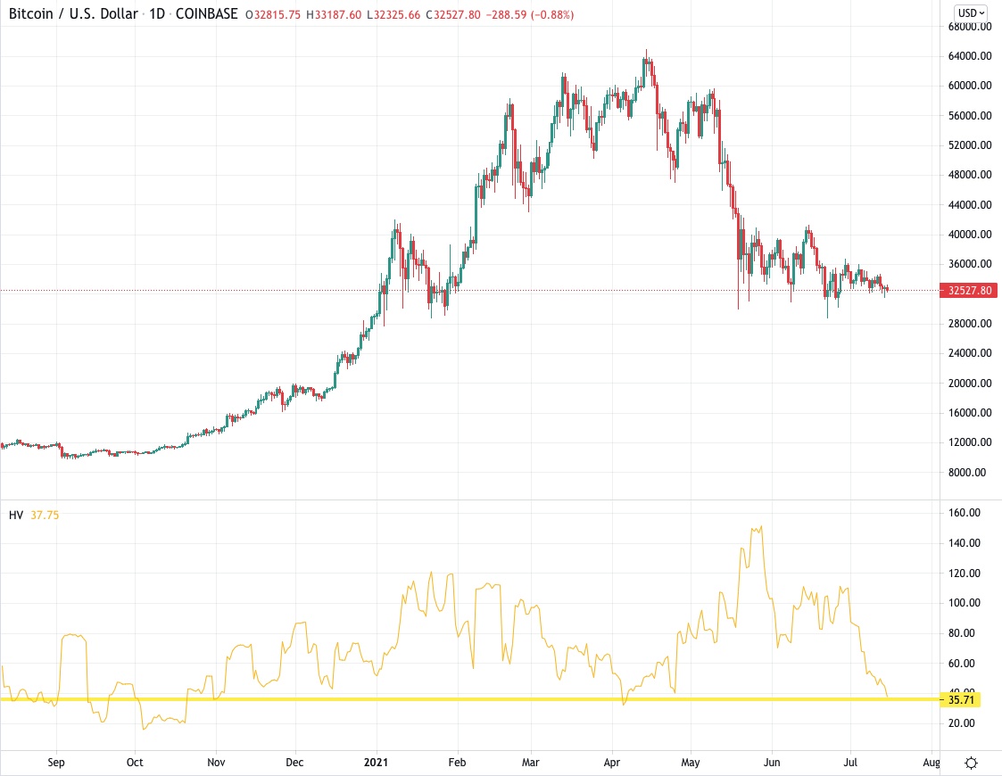 Historical volatility has been dropping hard for the past few weeks and the signal has now reached what I would consider its baseline range. Which means it’s going to break out in the near term future, mark my words.
