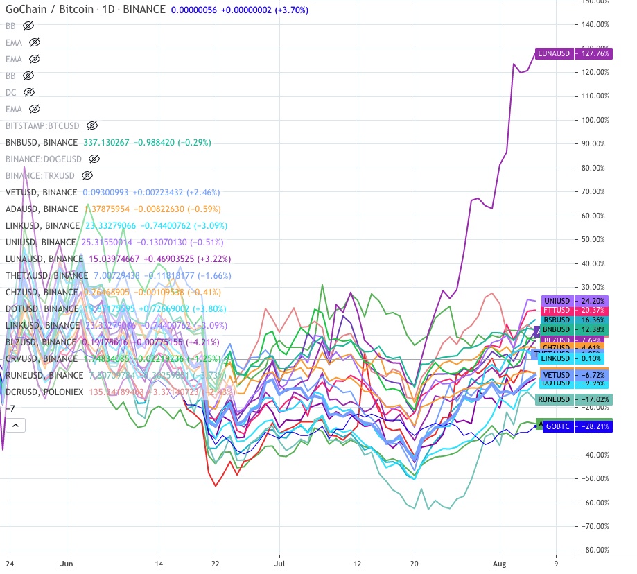 To that end the popular ‘don’t call me a shitcoin’ LUNA has thrown down a gauntlet to the other altcoins by taking a strong early lead. What you see above is a chart of all the major shitcoins overlapping on a percentage basis.