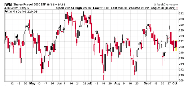 Back in mid-September we mentioned another bear call spread in IWM. One week later the spread trades for $0.30 for a quick profit of 9.9%. The max potential profit on the high-probability trade is 17.6%.