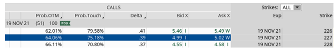 As a result, let’s say I try to sell a call with a delta somewhere around .40. The IWM 227 November call option with a delta of 0.39 fits the bill. We can sell the 227 call option in November for $5.00, or $500 per call. We can now use the $500 from the call sold to help finance the put contract needed to achieve our goal of protecting returns.
