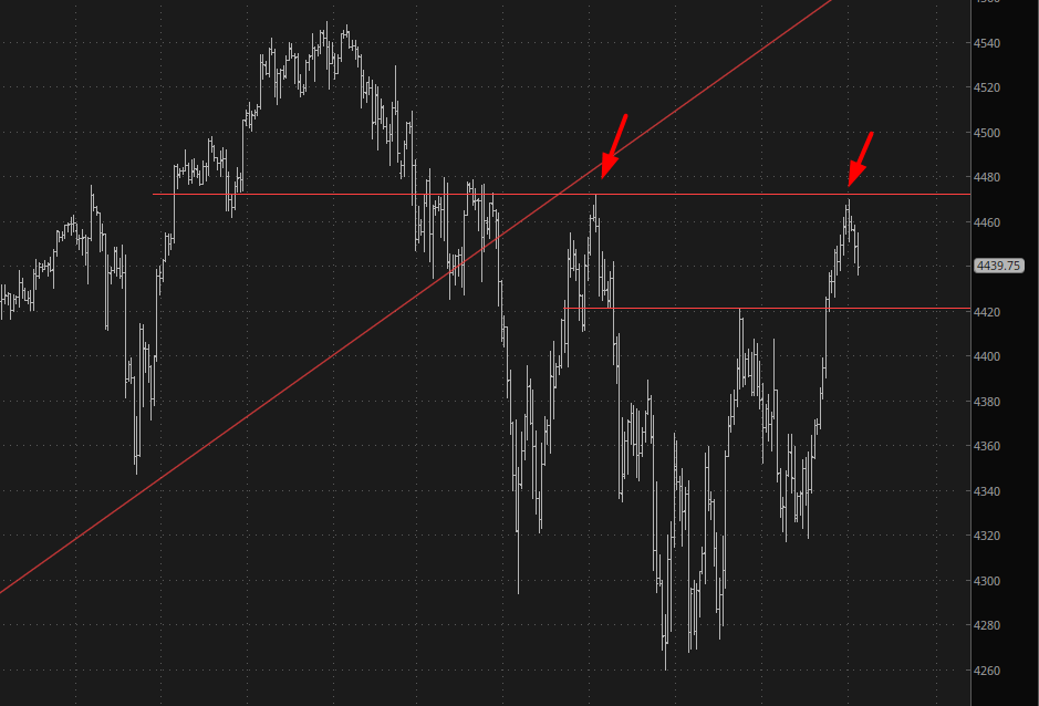 As for this morning, it’s naturally nice to see so much red, but as always, we must keep it in context. Below on the ES, we see that, regrettably, on Friday, the market pushed above its prior high, thus killing the cycle of lower highs. Mercifully, when the market zipped higher on Sunday, it did not violate yet another high, and in fact all the green turned to red in short order.