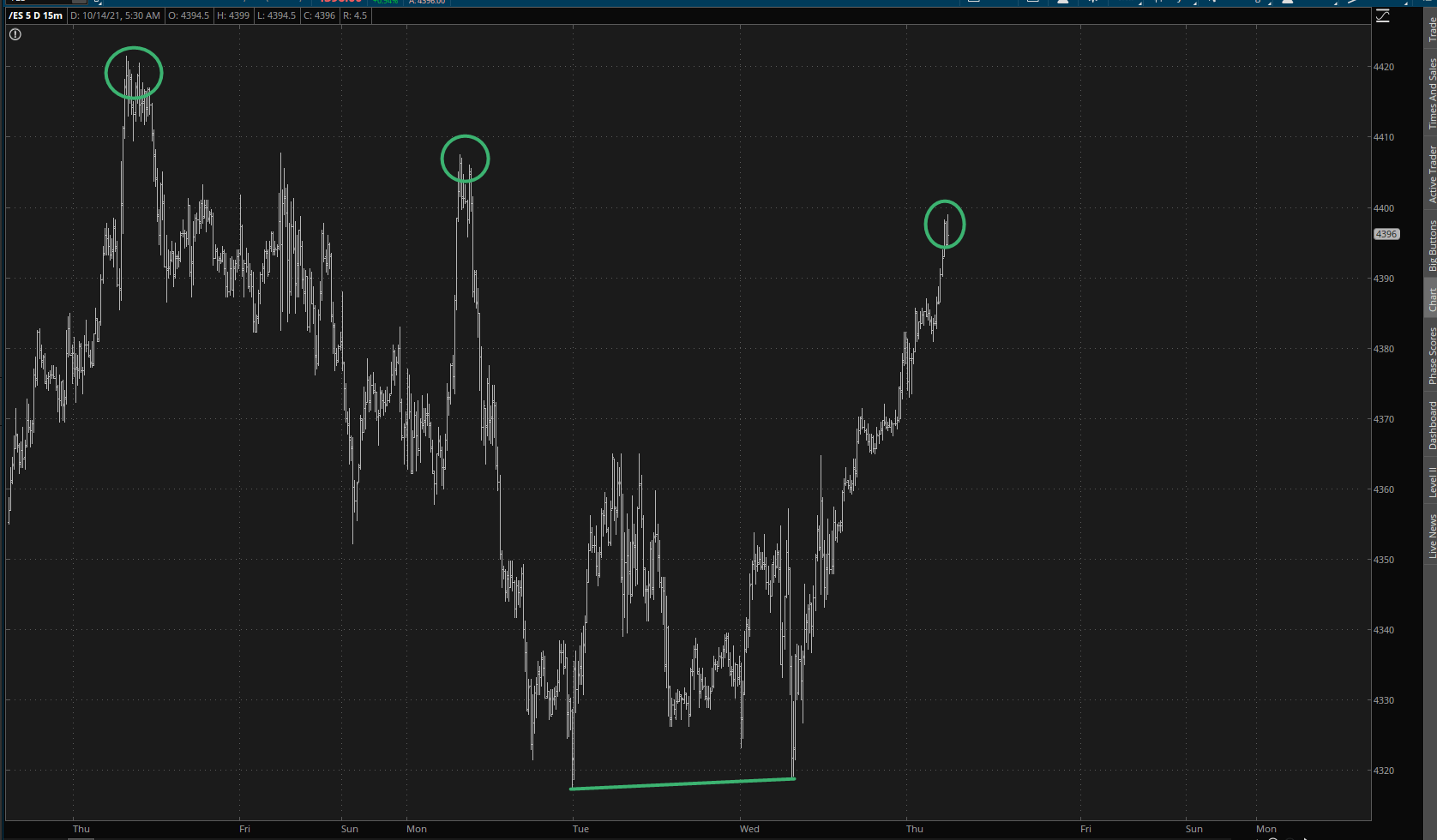 Let’s get back to that hearty rise in the /ES and, as we do, give it some context. There’s no doubt the past 24 hours have belonged to the briefly-beleaguered bulls. Looking at the 5 minute chart, instead of the 1 minute chart shown above, you can see this isn’t the first time we’ve had a powerful bounce, and for the moment, all we’ve done is craft another “lower high” (although it wouldn’t take much more strength to bust that series).