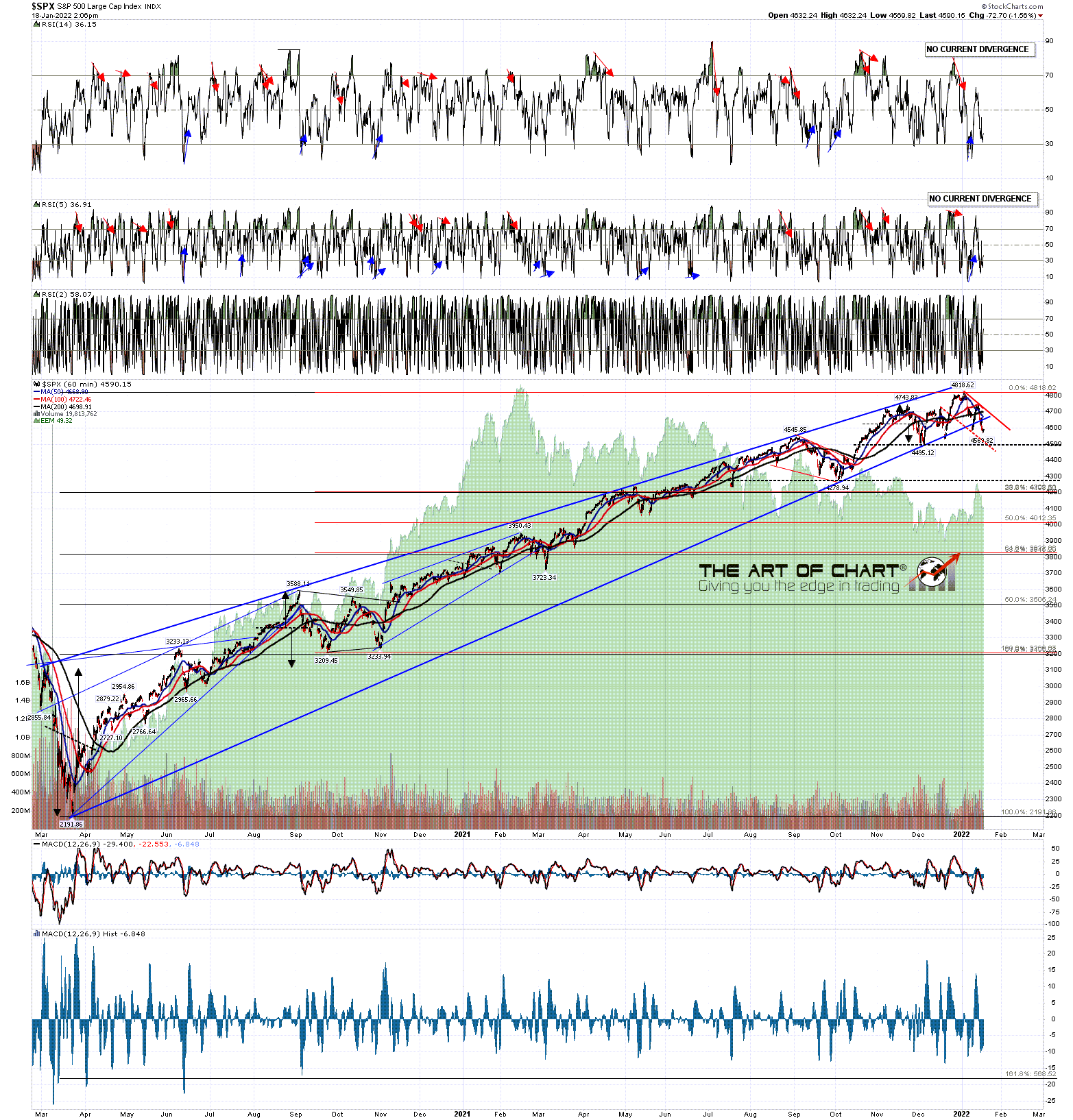 On NDX, which has not yet made a lower low, I am watching this leg of the retracement with particular interest. There is a high quality falling channel established from the last all time high and, if that holds, the obvious read would be that the channel is a bull flag channel. The possible falling wedge marked on the SPX hourly chart may also be a bull flag forming of course.