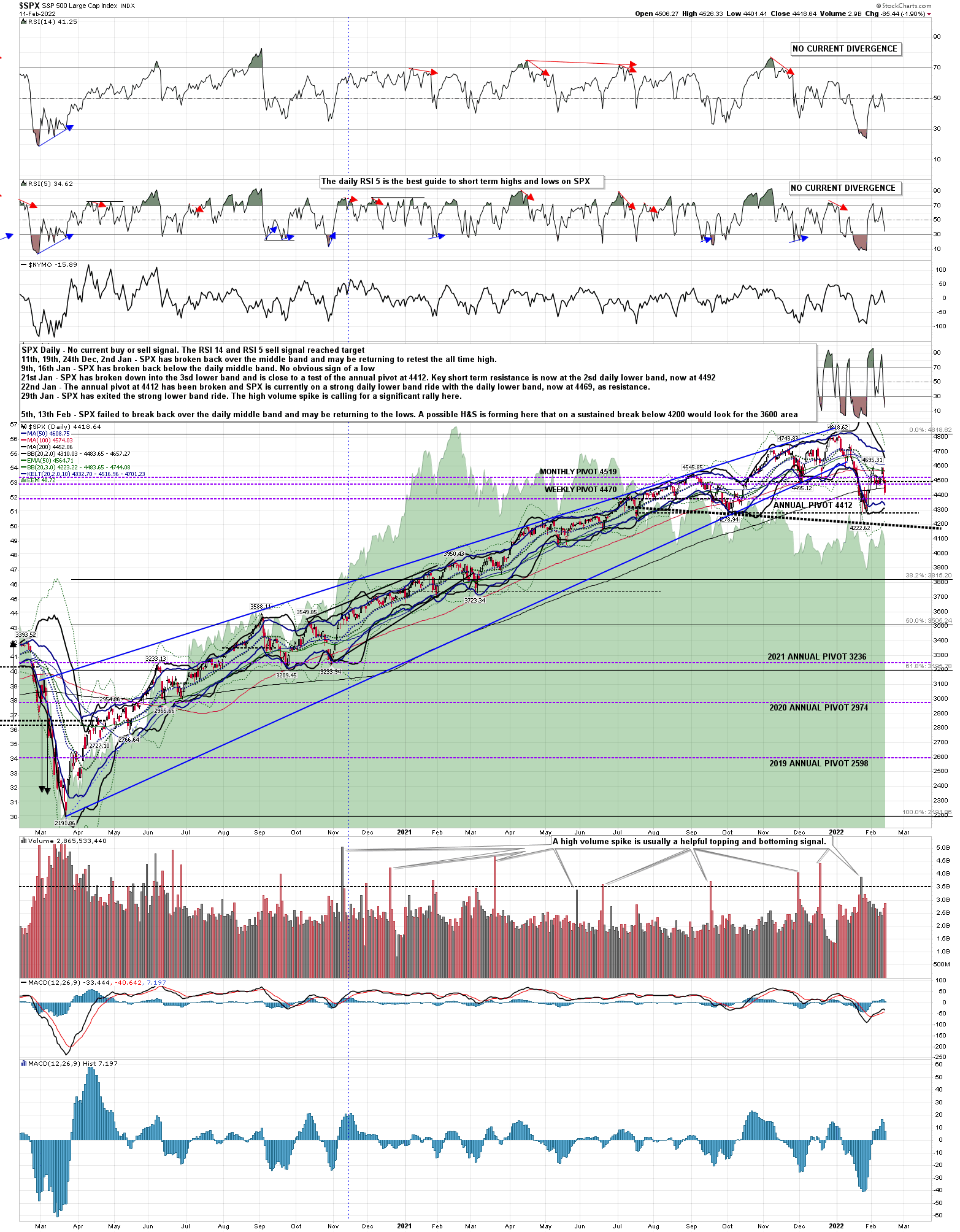In the short term though SPX has broken back hard below the daily middle band, which closed Friday at 4483, and as long as that confirms today with another close below it the obvious next move would be a retest of the 2002 low at 4222.62.
