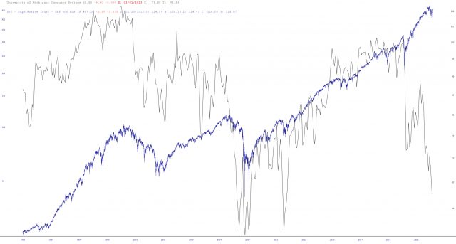 Here are a couple of interesting charts. This one is plotting the S&P 500 ETF SPY (blue line) against the Consumer Sentiment line (light blue). Notice how nicely they track until Covid-19 hits. I’d say there is some SERIOUS “catching-down” the market has to do with the nation’s psyche! Look at that spread!