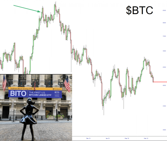 Some of you may recall that Coinbase went public pretty much the millisecond that crypto topped in April 2021. The odds of that happening by chance are equal to the odds of Oprah Winfrey not appearing on the next issue of her self-published magazine. Likewise, When BITO (which endlessly touts itself as ” the first U.S. bitcoin-linked ETF offering investors an opportunity to gain exposure to bitcoin returns“) came public, they didn’t hit it as precisely, but boy, were they close.