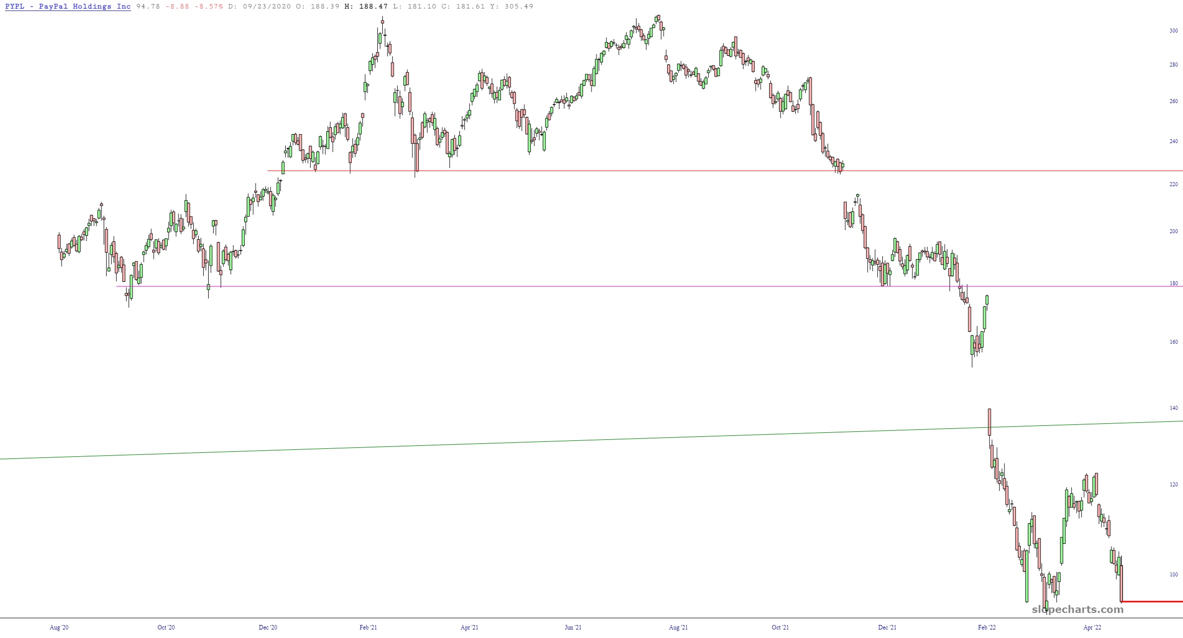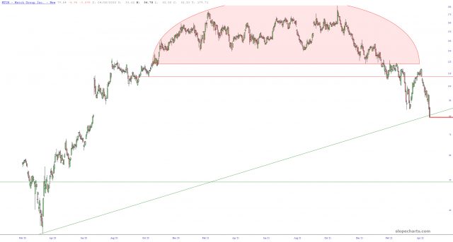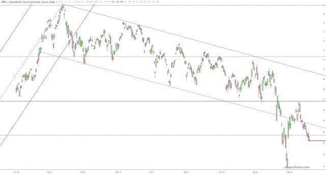 The emerging markets fund (symbol EEM) has been in its own, and virtually uninterrupted bear market, since it peaked February 16, 2021 (incredibly, more than 14 months ago; were only we so lucky in the U.S. to have stocks come to their senses like this!) It’s been an amazing progression, particularly given its relationship with its now-broken channel as well as its Fibonacci Retracements.