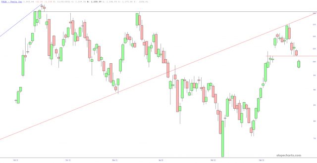 A week ago, I shorted TSLA at a price just above $1140. This morning, we got a new price gap at 1022.43, which I gladly accept as a new level of resistance. I’m keeping the position.
