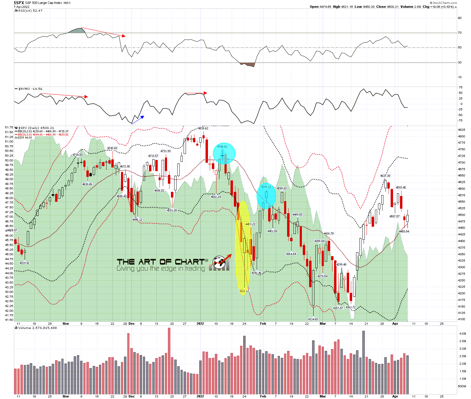 SPX is rallying from the daily middle band, and broken support on the way down is now resistance. The most important such resistance is at the weekly middle band. That is now at 4518, and a close above it would confirm the weak but definite close above at the end of last week. A close below would be a bearish failure to confirm.