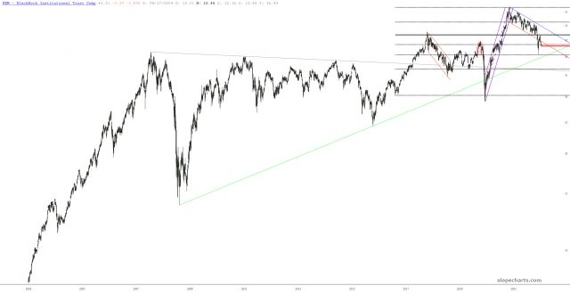 The emerging markets fund (symbol EEM) has been in its own, and virtually uninterrupted bear market, since it peaked February 16, 2021 (incredibly, more than 14 months ago; were only we so lucky in the U.S. to have stocks come to their senses like this!) It’s been an amazing progression, particularly given its relationship with its now-broken channel as well as its Fibonacci Retracements.