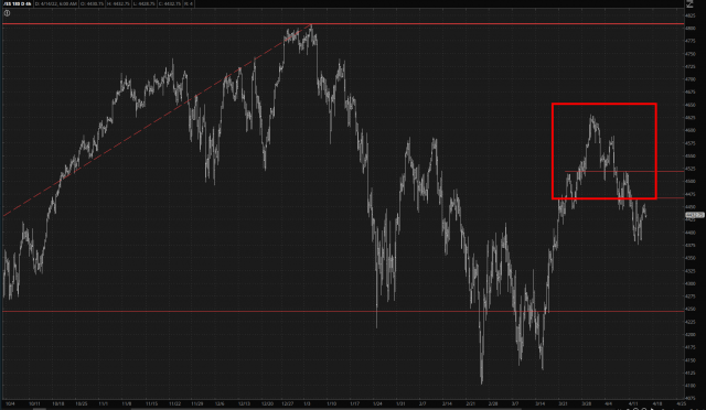 Going back even farther still, you can see how we have spent weeks dicking around for no productive purpose. Brokers are delighted at the commissions, but there’s absolutely no trend to be seen.