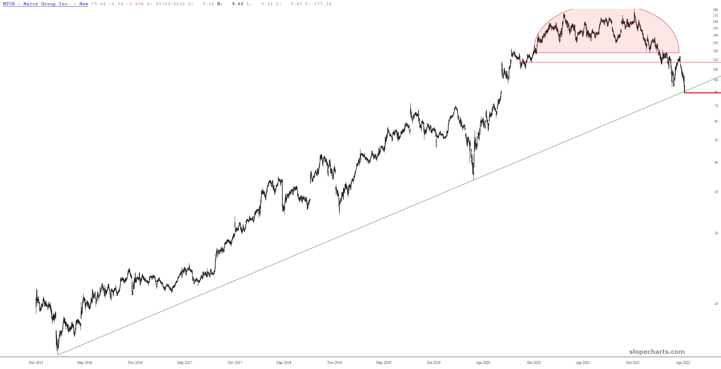 The lifetime chart of MTCH shows that it has also broken its long-term trendline. I’m hanging on to my options, as they don’t expire for 148 more days, and I believe there’s plenty more potential for weakness (plus 93% of the option’s value is intrinsic at this point, so I’m paying almost nothing for all that time).
