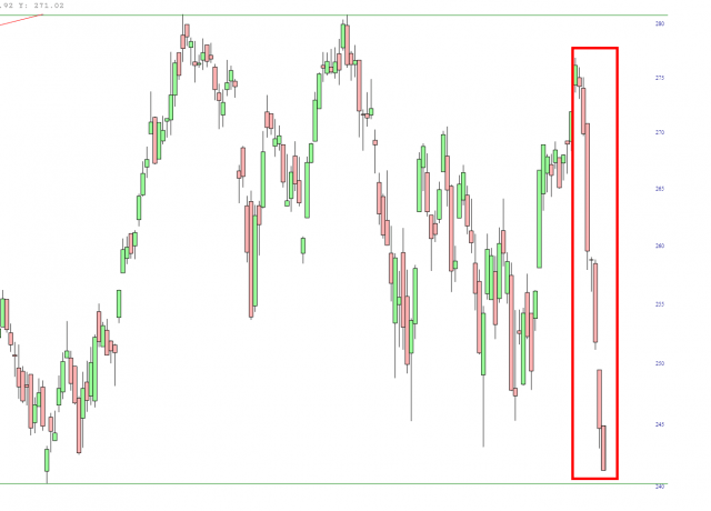 Now here’s something you don’t see every day. Or any day. Because for the Dow Transports to collapse five consecutive days is, well – – it’s pretty cool. They’ve traversed their entire range in a single week. As God Intended.