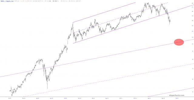 This most recent channel held in place for a couple of years, but it broke this month. My view is that AAPL will keep slipping in price until it finds (temporary) support at the trendline of its prior, larger channel. In other words, this party has a ways to go.