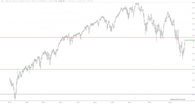 I’ve mentioned 4100 (approximately) as a key level on the /ES futures, and we’ve pushed past that (strictly speaking, the retracement is at 4165.02, so we have NOT exceeded the line, as today’s peak has been 4126 as of the composition of this post):