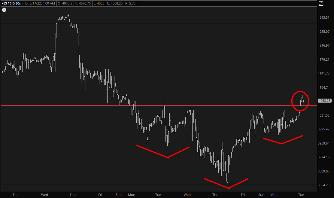 I honestly didn’t think the entire countertrend rally would be neatly contained within two days, and this pattern completion affirms that. I’m afraid that patience is going to be, once again, be a critical commodity, as we might have a 5% rally in front of us (and that’s just on the big boring /ES, to say nothing of the much friskier individual equities).