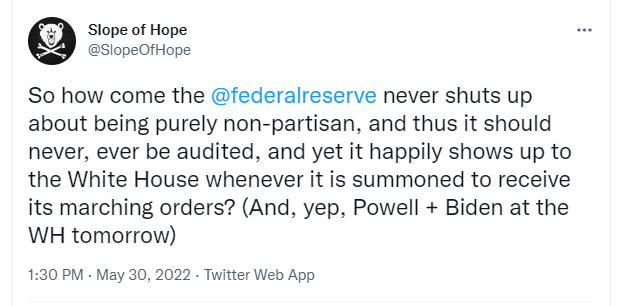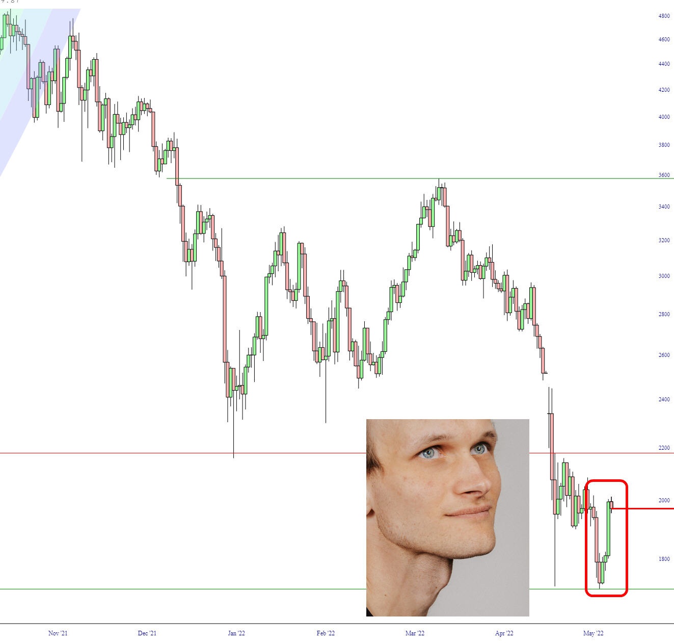 Of particular interest to me during this long weekend was the behavior of Ethereum, which on a daily basis I point to as a crucial gauge of the animal spirits. To put it succinctly, the double-digit percentage rise in $ETH is welcome, because in my opinion it allowed the lads to get the entire run out of their system in one fell swoop and has set us up for another exhaustion point. On Friday, we can within one PENNY of support failure, but they saved it. Next time, I don’t think they’ll be able to do so.