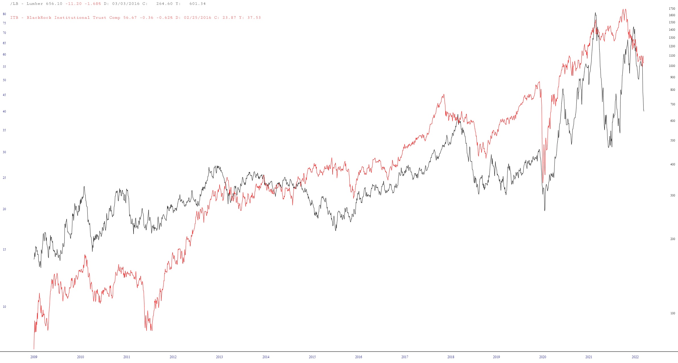 I messed around with layered charts to see if there was any kind of “lead” with respect to lumber and homebuilders, but the truth is that they follow pretty much in lockstep. I didn’t have to do any time shift at all.