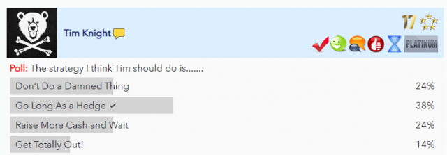 I want to thank everyone for their generous suggestions in last night’s “What do I do??” post. The poll results were spread fairly evenly, although the distribution isn’t at all a surprise to me. Suffice it to say I’m strongly inclined to follow your counsel and take on a meaningful long position to act as a salve at the all-too-likely rally.