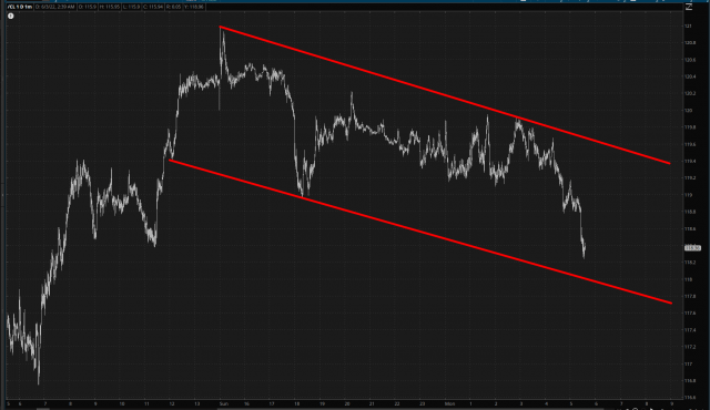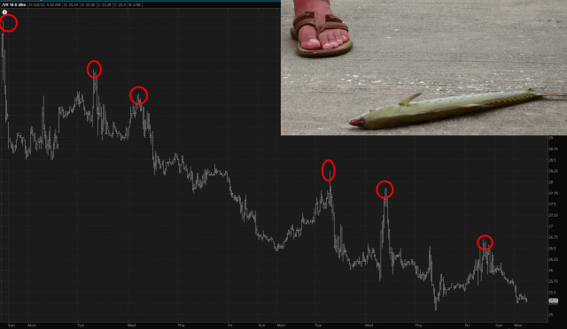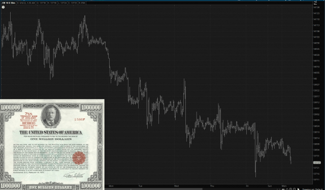 And, at the same time, the whole “risk on” environment seems to be going hand-in-hand with people walking about from the boring old world of bonds, as /ZB continues to slide (and, thus, interest rates continue to soar – – which, which sky-high energy, is sure to make for a crackerjack economy).