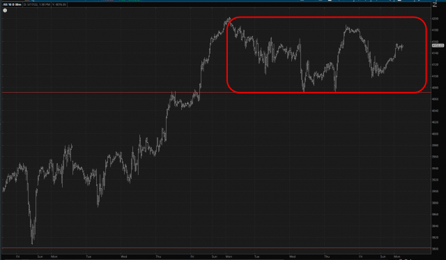 As for equities, we’re still in this grinding range between 4244 for top and 4071 on the bottom. The /ES hasn’t pushed as high as 4244, actually. It only got a little above 4200. I merely mention 4244 since that’s the Fibonacci level, and should we pass 4202, then 4244 would be the next logical level to watch.