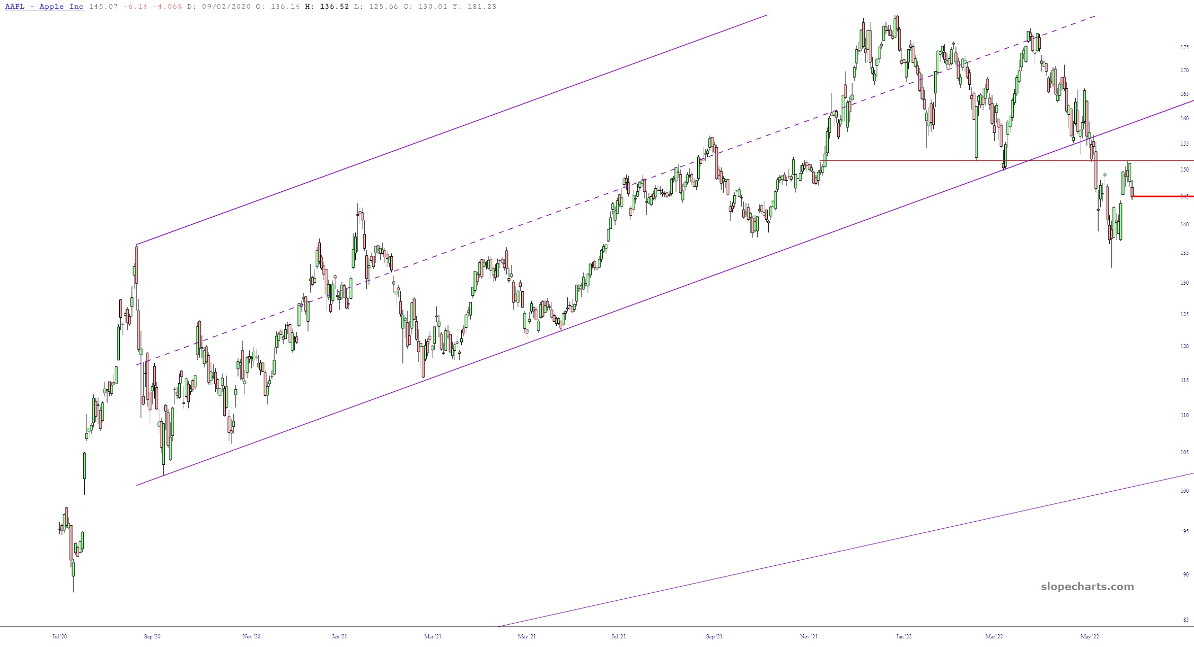 Whenever I’ve mentioned Apple, I’ve mentioned its broken channel, which is the most important feature of this largest-of-all-public-companies. I’m pleased to see that yesterday’s peak was the exhaustion point, and we’re reversing away from that very potent failed pattern.