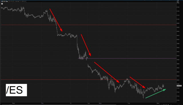 Looking at the /ES, we can see how over just the past few days, we engaged in a series of exciting down-steps, but with less vigor (that is, a more muted angle) every time. And, over the past couple of sessions, we’ve got our first little uptrend cooking, with a fairly decent bullish base spread out over the week so far.
