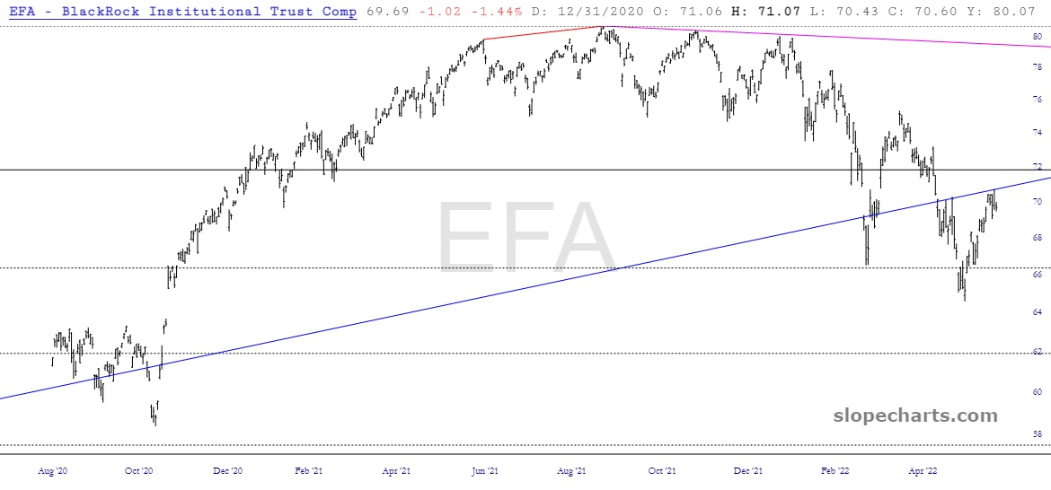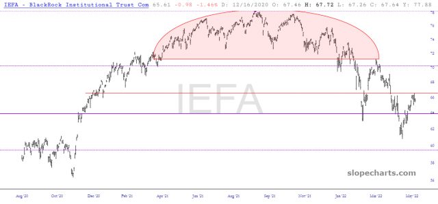 The worldwide equities had been hammering out a fantastic series of increasingly dramatic lower lows and lower highs, with the added bonus of being perfectly beneath the long-term trendline, shown below in blue. I’ve put the similar IEFA just beneath it.