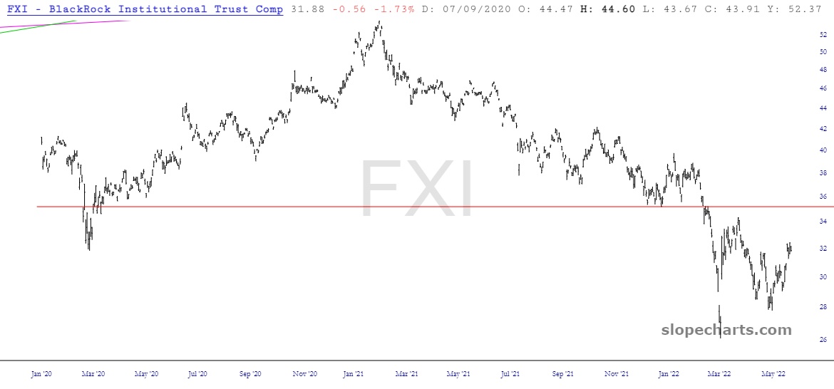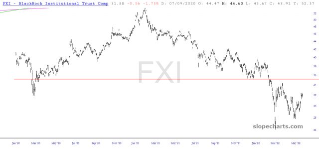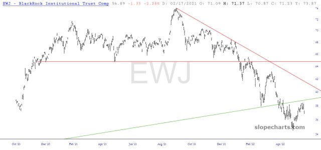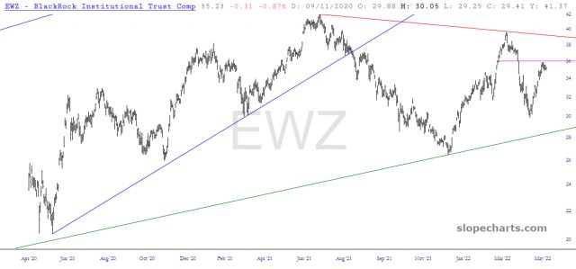 Let’s jump outside North America and look at the big funds. The emerging markets has been incredibly weak for a very long time, and it couldn’t even muster getting past that horizontal last week, even at the market’s strongest.