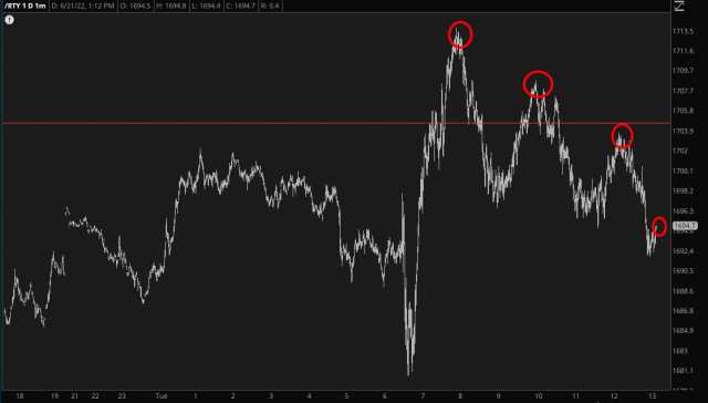 In turns, although equities had a very strong bullish day, it’s quite evident they sputtered and wheezed their way into the close. Here is the /RTY to make this point: