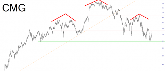 I presently have 40 different bearish positions. One of them I entered yesterday was Chipotle, which has crazy-expensive options. I got it through my thick skull that it’s OK to have a hybrid account, and I could simply short the stuff even in the midst of a bunch of normal put options. So I shorted it at $1323.