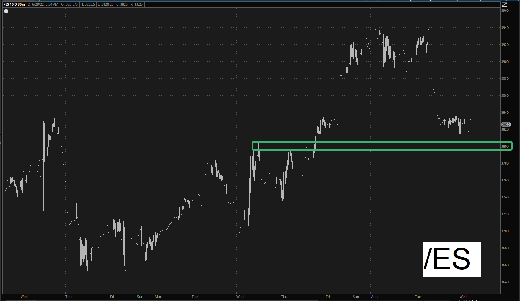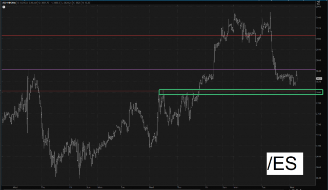 The key for us bears is to take out 3800 on the /ES. That’s a psychologically-important level, and it also constitutes the dividing line between the basing pattern and everything afterward.