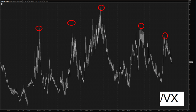 The peaks in fear have been remarkably regularly-spaced during this year, and quite obviously we’re burning off the latest one right now. It hasn’t descended to any kind of meaningful support yet.