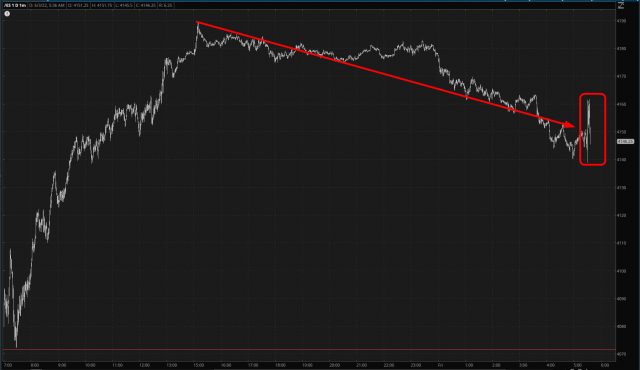 More germane to my interests, the equity futures had been on a gentle downslope all night long. When the jobs report came out (which, I suppose, was welcomed since the wages didn’t come in hot) there was a diminishment in the drop, but as I am typing these words, we’ve slipped back down to the lows.