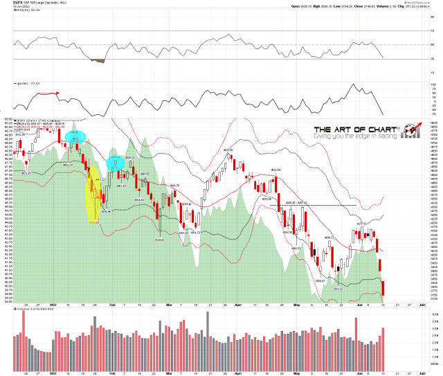 The daily bollinger bands on SPX are turning down again and expanding. SPX broke well below the daily lower band yesterday and is potentially in range of the 3sd lower band, which closed yesterday at 3690. If we were to see that hit in the next day or two that would be an excellent area to see a strong bounce.