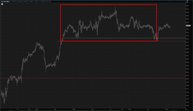Generally speaking, the morning belongs to the bulls, as every single quote is green (except gold, of course, which is forbidden by federal statute from doing anything but disappointing). The beautiful top on the /ES got spoiled by the post-earnings giddiness of MSFT and GOOGL, so now we’re still grinding away in this range between about 3920 and 4000. It’s a shame that we have to gird our loins for as despicable a bureaucrat as Jerome Powell, but there we have it.