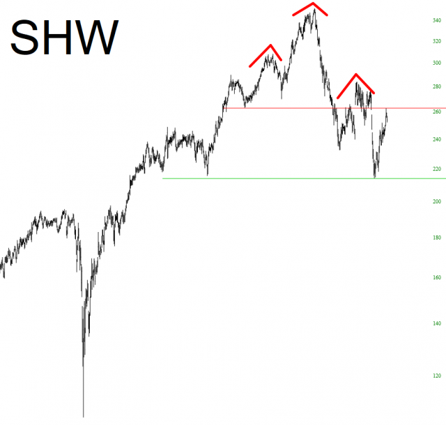 Anyway, it’s good to start off what could be a very tough day with some good news, and that comes in the form of a paint can. Specifically, Sherwin Williams. Back on June 15th, I did a premium post pointing out the head and shoulders pattern on this fabled paint maker (symbol SHW). Regrettably, in spite of the quality of the pattern, SHW Is not immune to the market in general, and the enormous rise in stocks starting June 15th spoiled the idea and I promptly got out at a loss.
