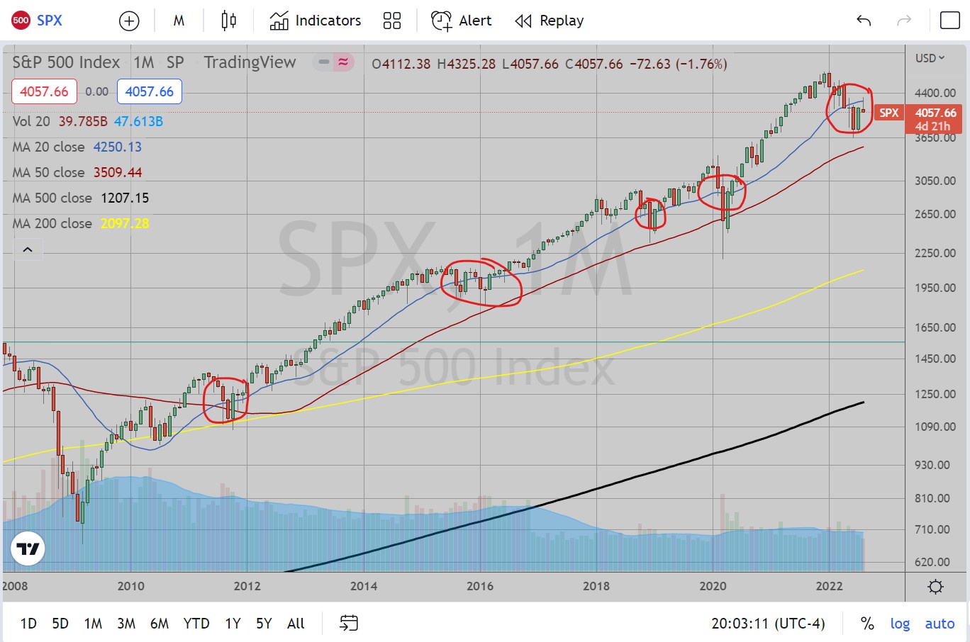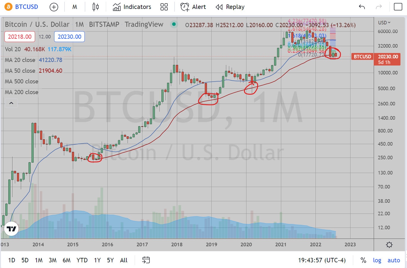I don’t trade Bitcoin, but I have been bearish on it for some time (albeit even before its meteoric rise so that is not saying much), But it is at a key spot right now that is telling about its near-term future. In this case, the 50-month Exponential Moving Average is at 21904. It has tested this moving average 3 times since 2015 and this 4th time is different. It did trade beneath it in 2020 during the Covid bear market, but closed the monthly candle above this average.