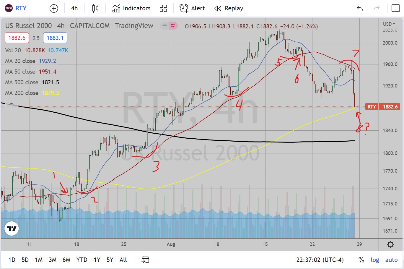 The Russell 2000 on a 4-hour chart looks interesting. Rather than go out monthly, I wanted to show how shorter time frames might work. This had a successful bullish crossover over the 50-4hr EMA back in July 15th. There was a pullback retest on July 18. This got close to that 50 EMA a few times and successfully pushed higher and even attempted another base on August 18 (spot 5) but failed and crossed back beneath this average at spot 6. Then we saw a perfect retest from under this average at spot 7 for a rollover we saw Friday.