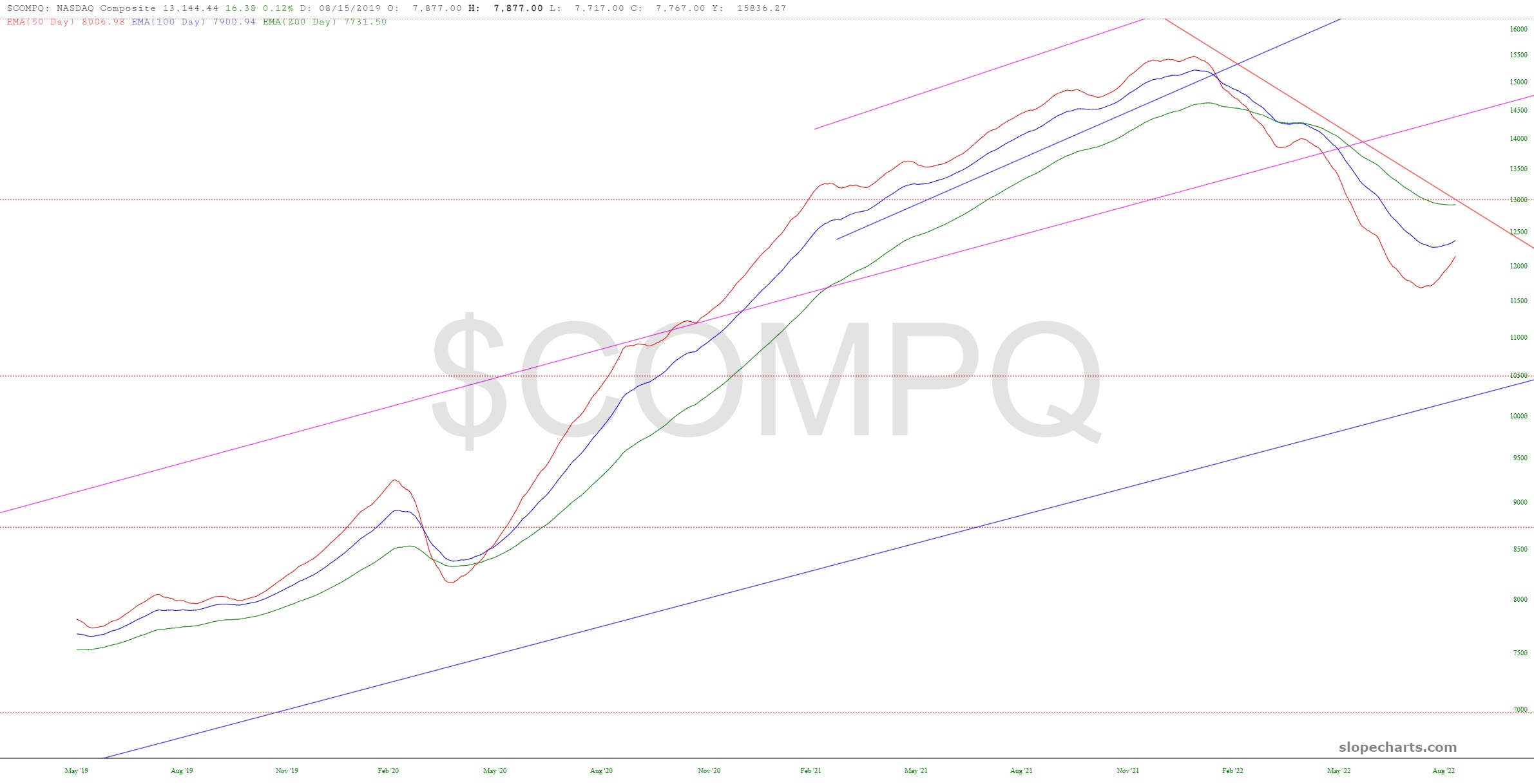 Everywhere I look, folks are talking about how the S&P is at its 200-day moving average again. I’m not sure what they’re talking about. To my eyes, it crossed over that a long time ago. I do think it is worthwhile to observe what the 50/100/200 day exponential moving averages are doing with the big indexes, however. I have deliberately hidden the price bars, since they are just noise for our purposes.