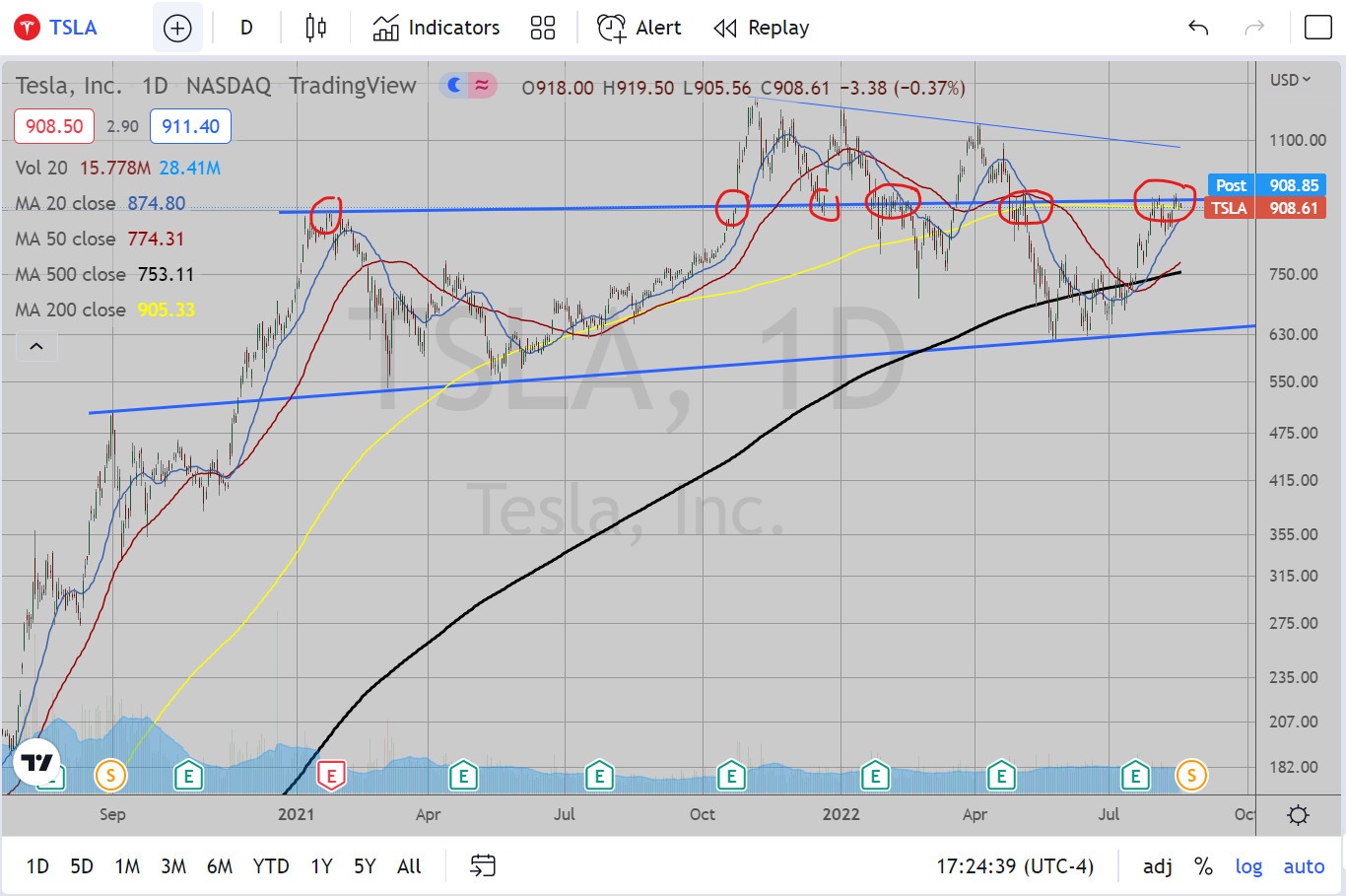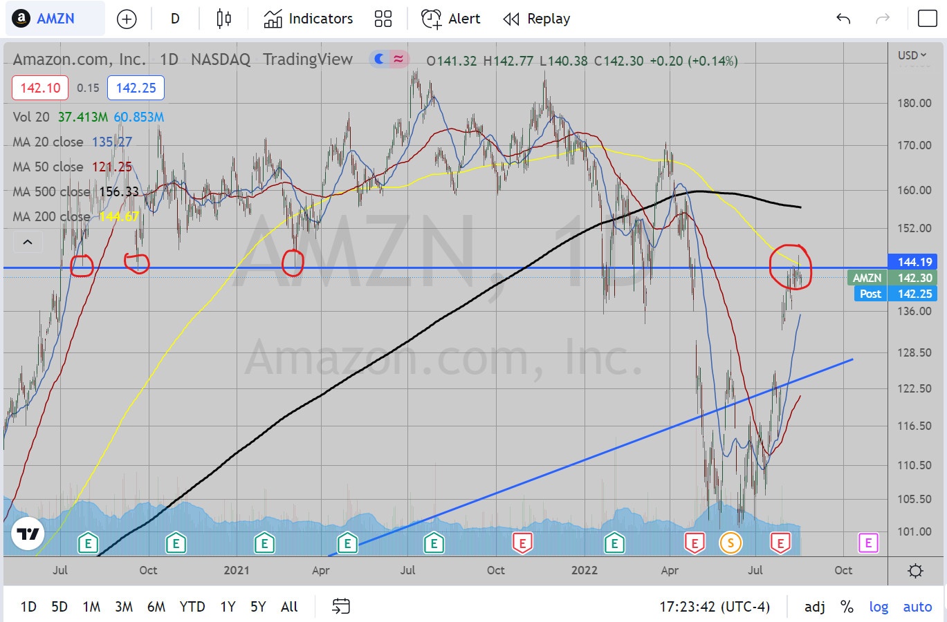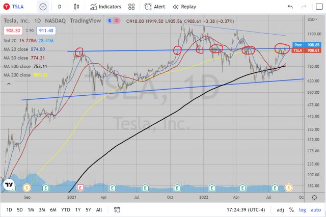 I swear, this thing is just f***ing with me. It is at a major downward sloping trendline from the January 2022 peak. This is probably the strongest stock out there and is singlehandedly holding up the S&P and the Nasdaq. Yet, it successfully is showing some choppiness at the trendline. At this point, I am just hoping this resistance holds.