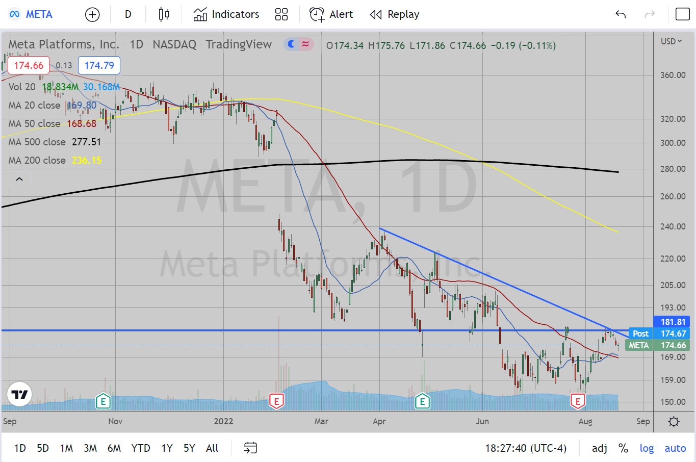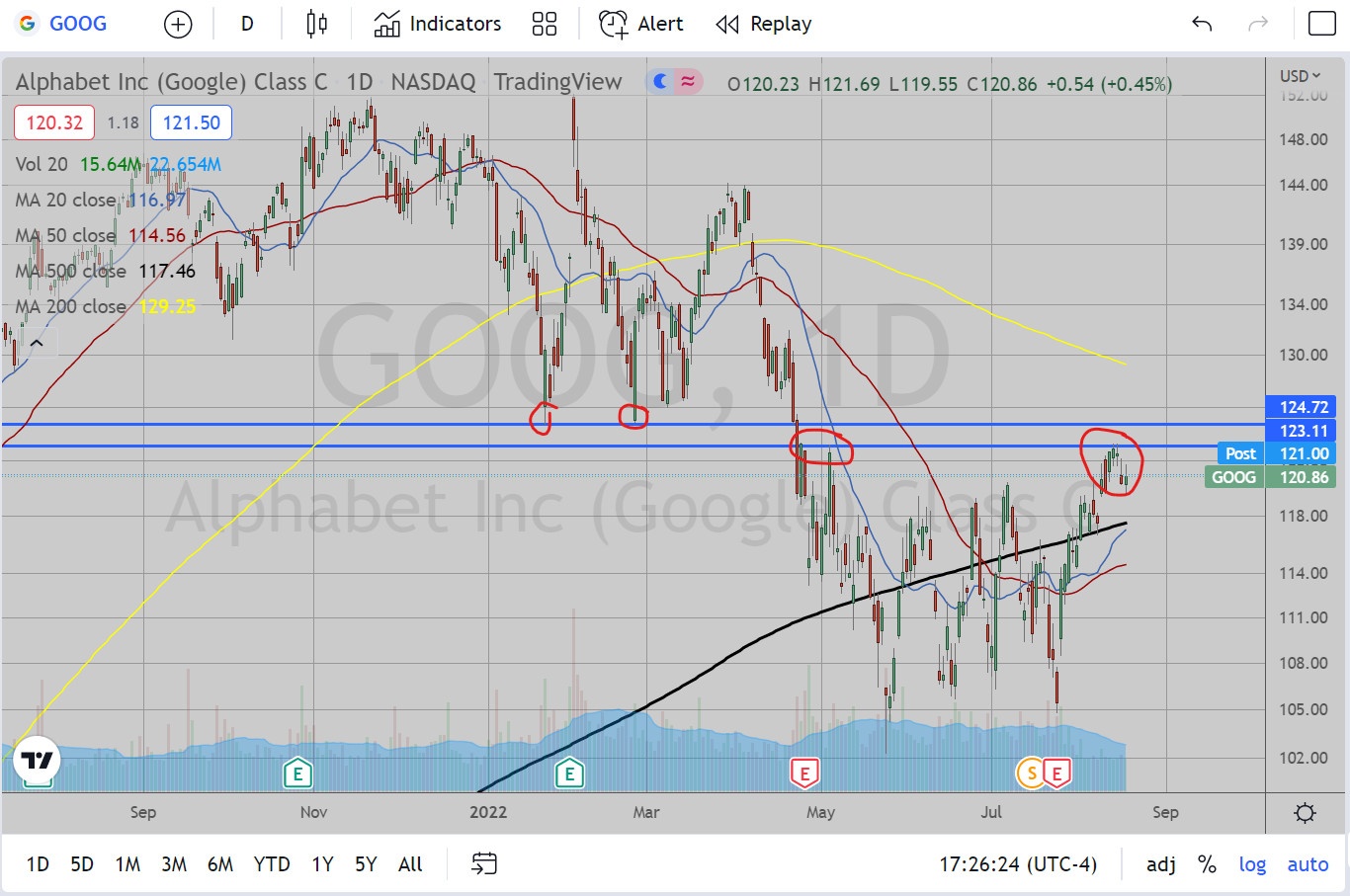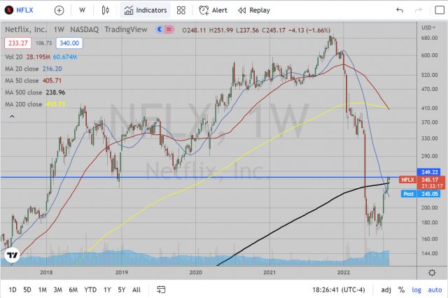 The more I looked at this one the weaker it looks relative to most of the other FANG stocks. There is the previous support level at 124.6 (support from June, July of 2021, January and February of 2022), which this could not manage to hit. Once it broke beneath this level in March, it managed to find resistance at 123 in April and May. It is attempting a basing pattern breakout above 119-120, but it is not exactly knocking my socks off.