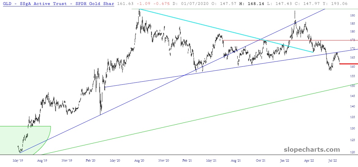 GLD – I’ve stopped messing with gold, because it always, always, always disappoints me. So, as I watch from a safe distance, it’s doing precisely what I anticipated which is retracing back to that broken blue trendline and then resuming its tumble.